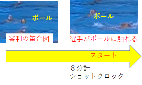 笛の合図の後、ボールが競技者の手から離れた瞬間にタイマーを始動させる。