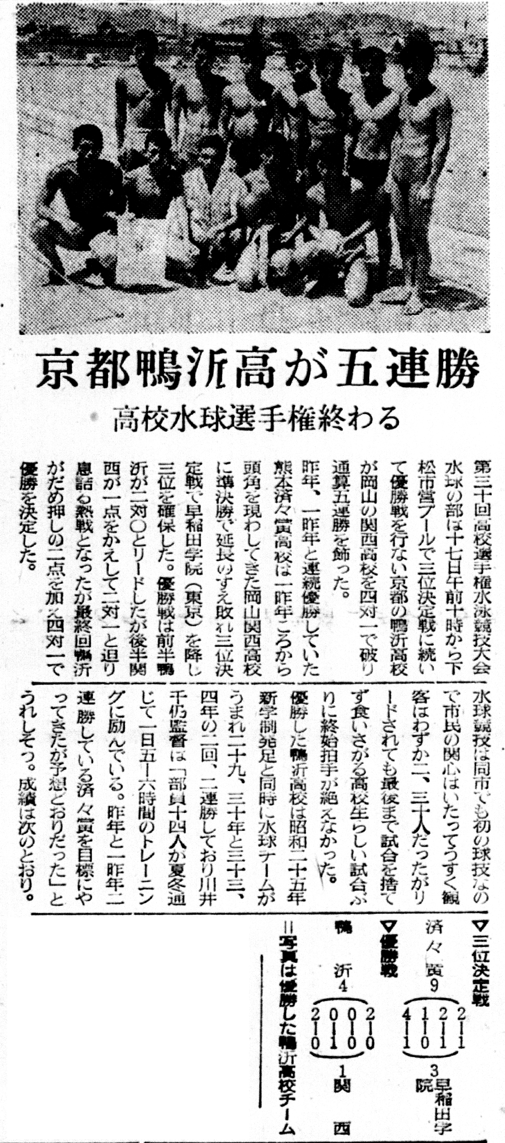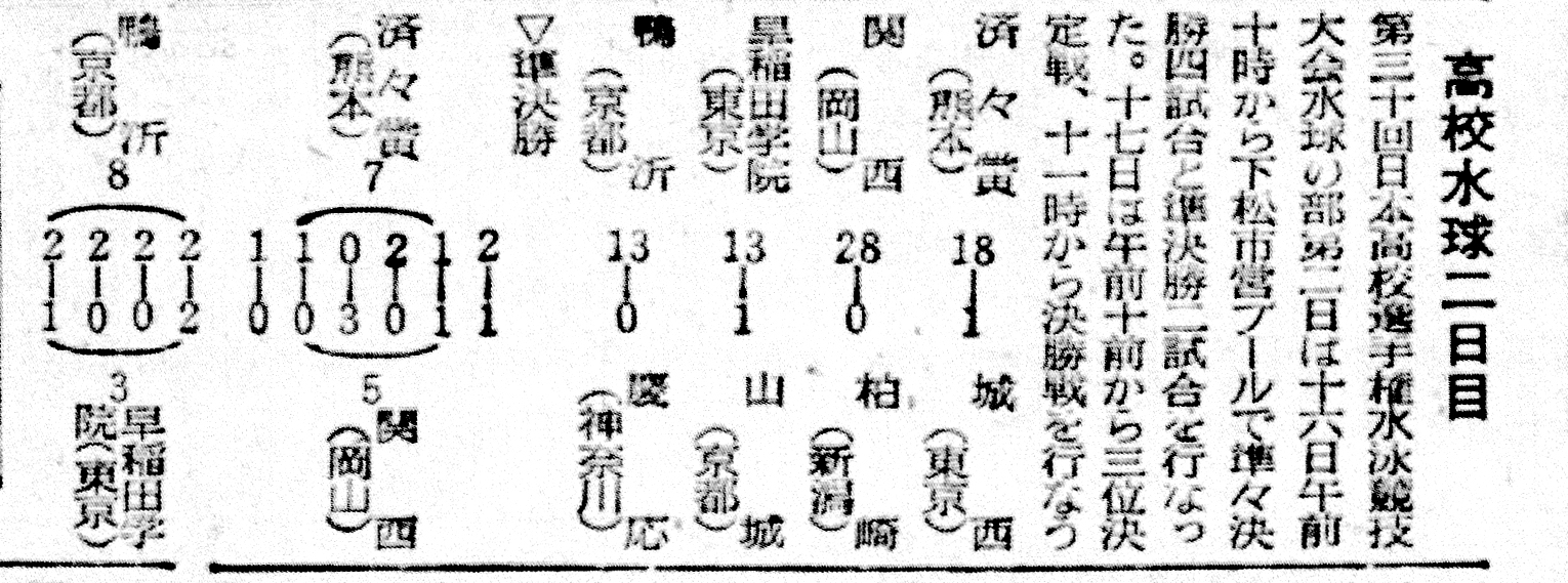 地元新聞社側に水球競技の諸データがなく、当時の記者が予備知識もない中で苦労して書いたと思われる内容。